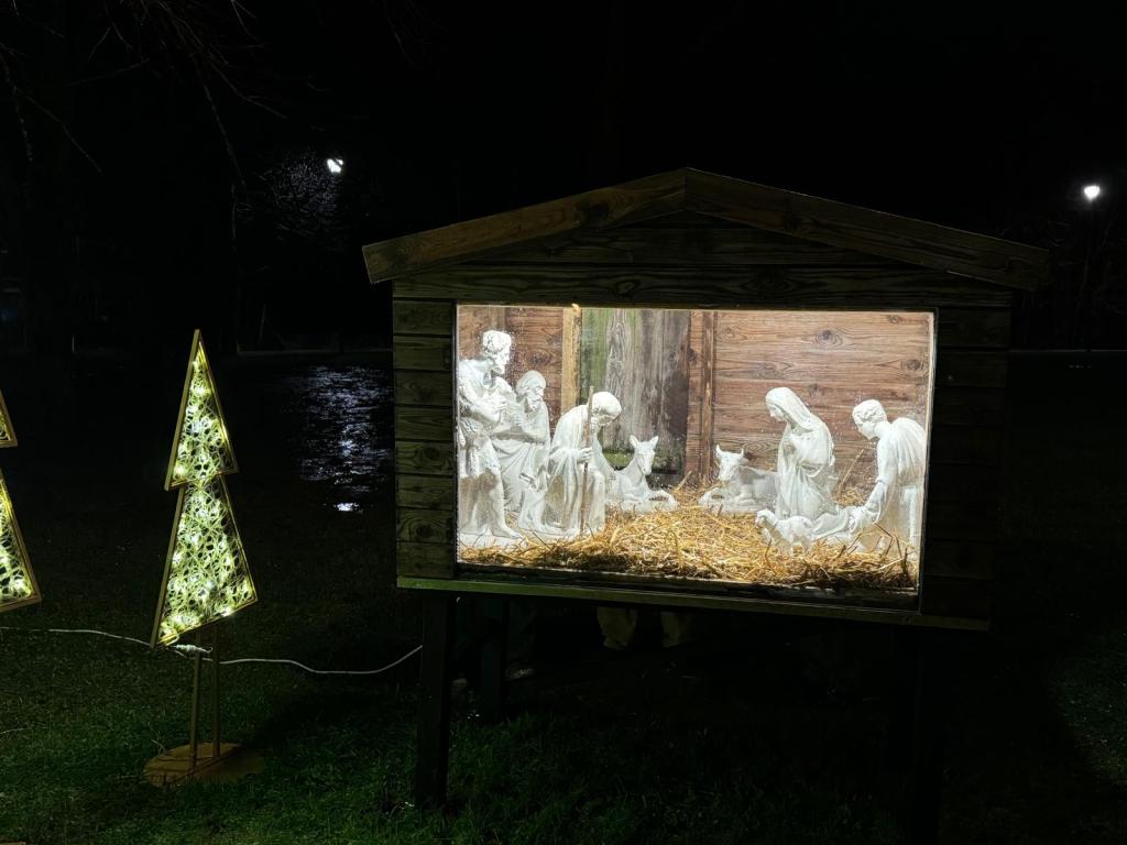 15 jours plus tard, grâce à l’enthousiasme et aux talents de chacun, et avec l’accord de la commune, une belle crèche prend vie sur la Place Communale.